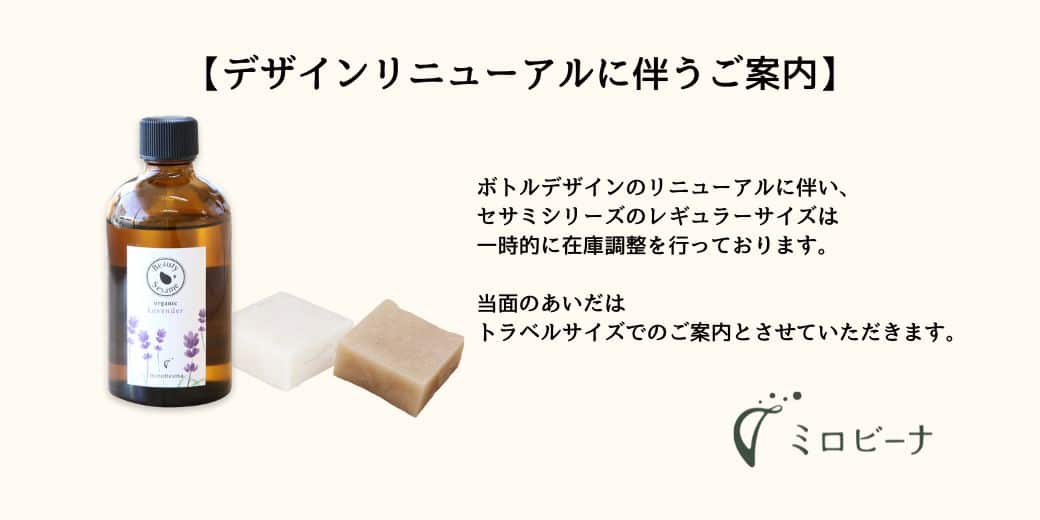 この度、ボトルデザインのリニューアルに伴い、 現在セサミシリーズのレギュラーサイズにつきましては 一時的に在庫調整を行っております。 恐れ入りますが、当面のあいだはトラベルサイズでのご案内とさせていた ...